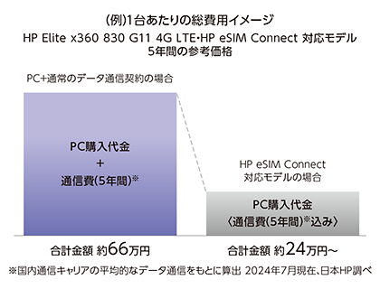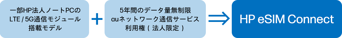 HP eSIM Connect 対応モデルは、HPの法人向けノートPC(4G LTE、5G モデル)にデータ通信上限なしのeSIM サービスを組み合わせることで、いつでもどこでも働く環境を提供。